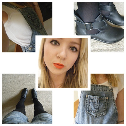 Today I am wearing Primark dungarees, H&M white T-shirt, Primark black tights and New Look cut-out boots. On my lips is neon red (916) by Revlon.